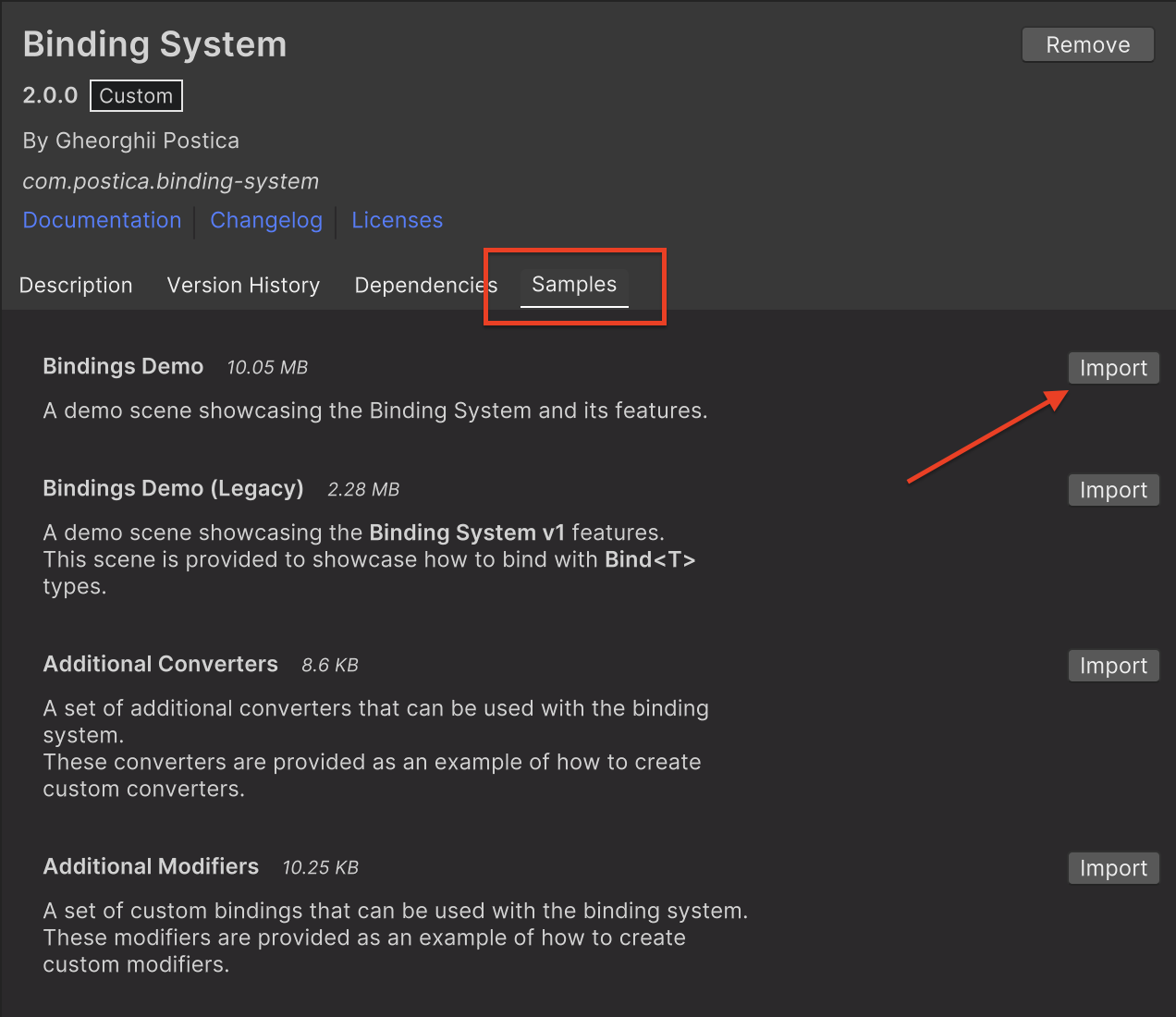 To install the demos, select Binding System in Package Manager. Navigate to "Samples" section and proceed to import the samples you want.