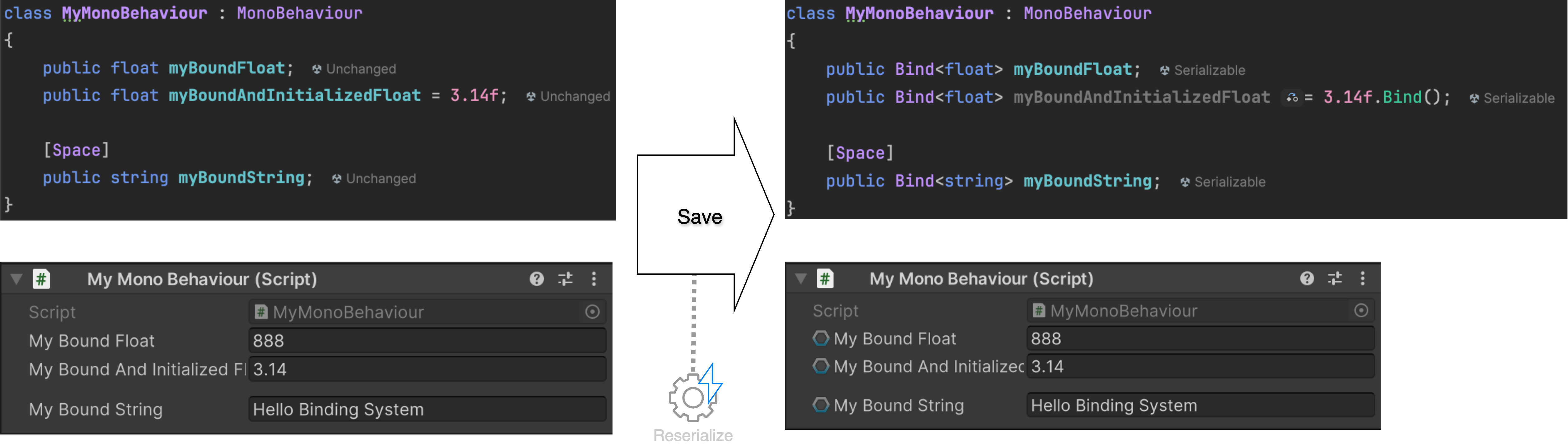 Reserializer triggers only when there is a code change, either added or removed, involving one of the <mark style="color:orange;">`Bind<T>`</mark> classes.