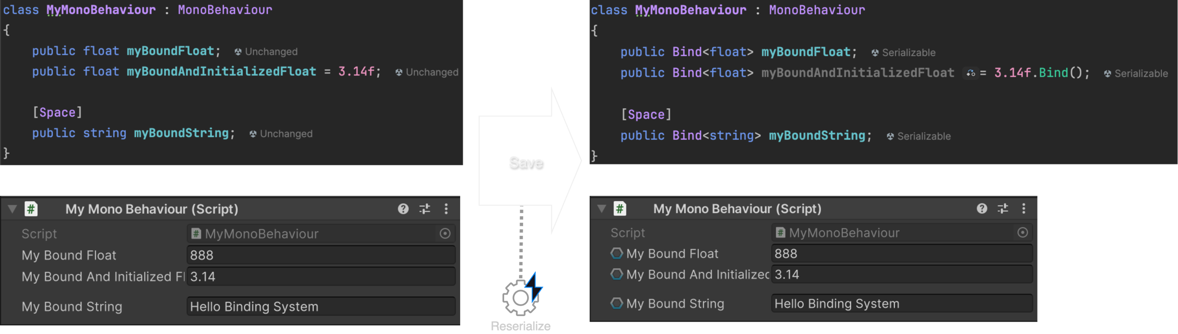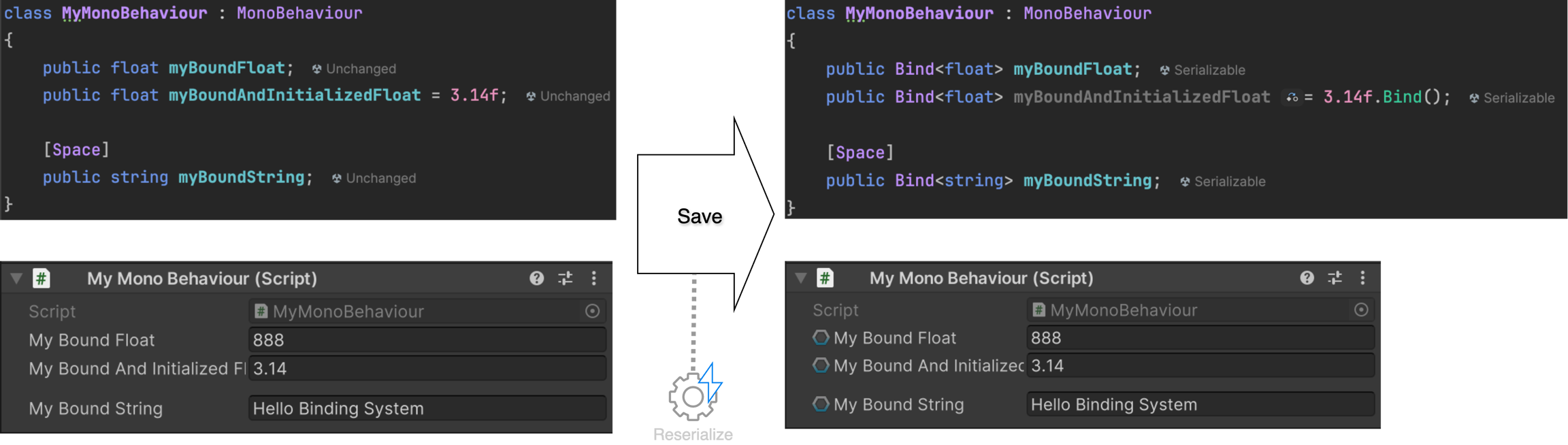 Reserializer triggers only when there is a code change, either added or removed, involving one of the Bind<T> classes.