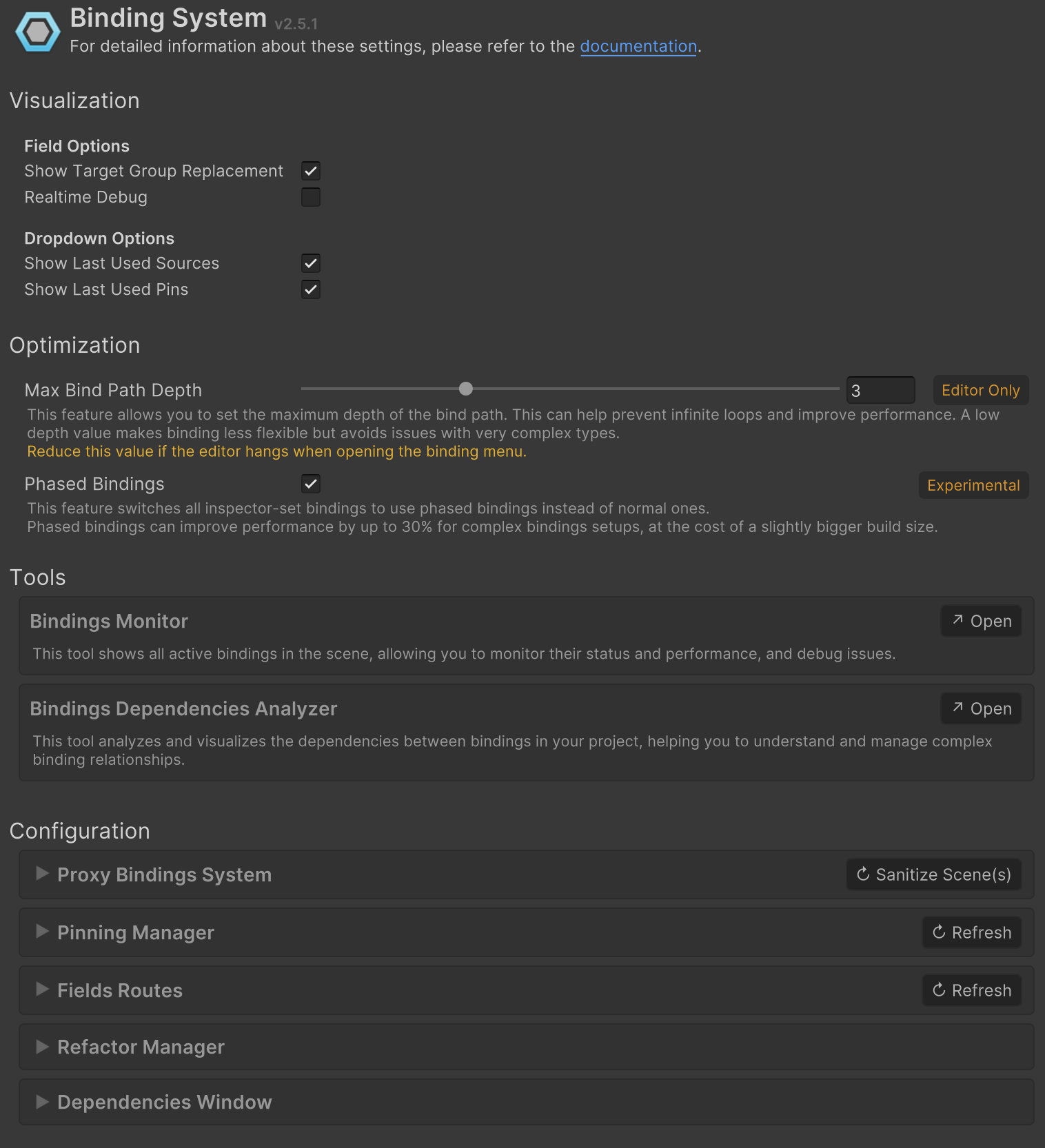 * **Max Bind Path Depth**: when selecting members to bind, how deep the dropdown allows to navigate. A higher depth means gives more flexibility at the cost of performance during dropdown popup.